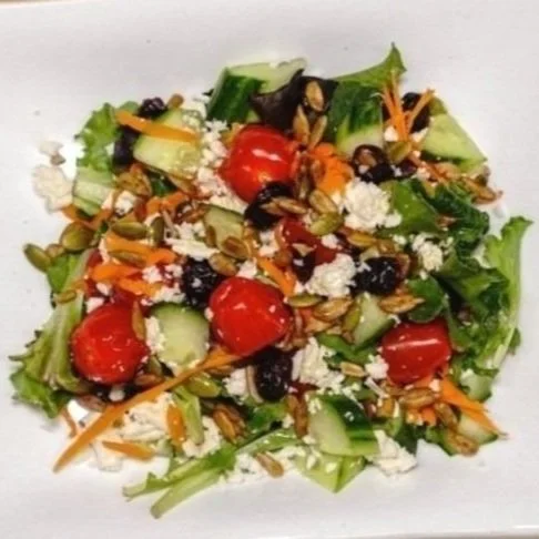 ◈ Heritage Green Salad with heritage greens, cherry tomatoes, cucumbers, carrots, feta, pumpkin seeds, and honey balsamic vinaigrette.