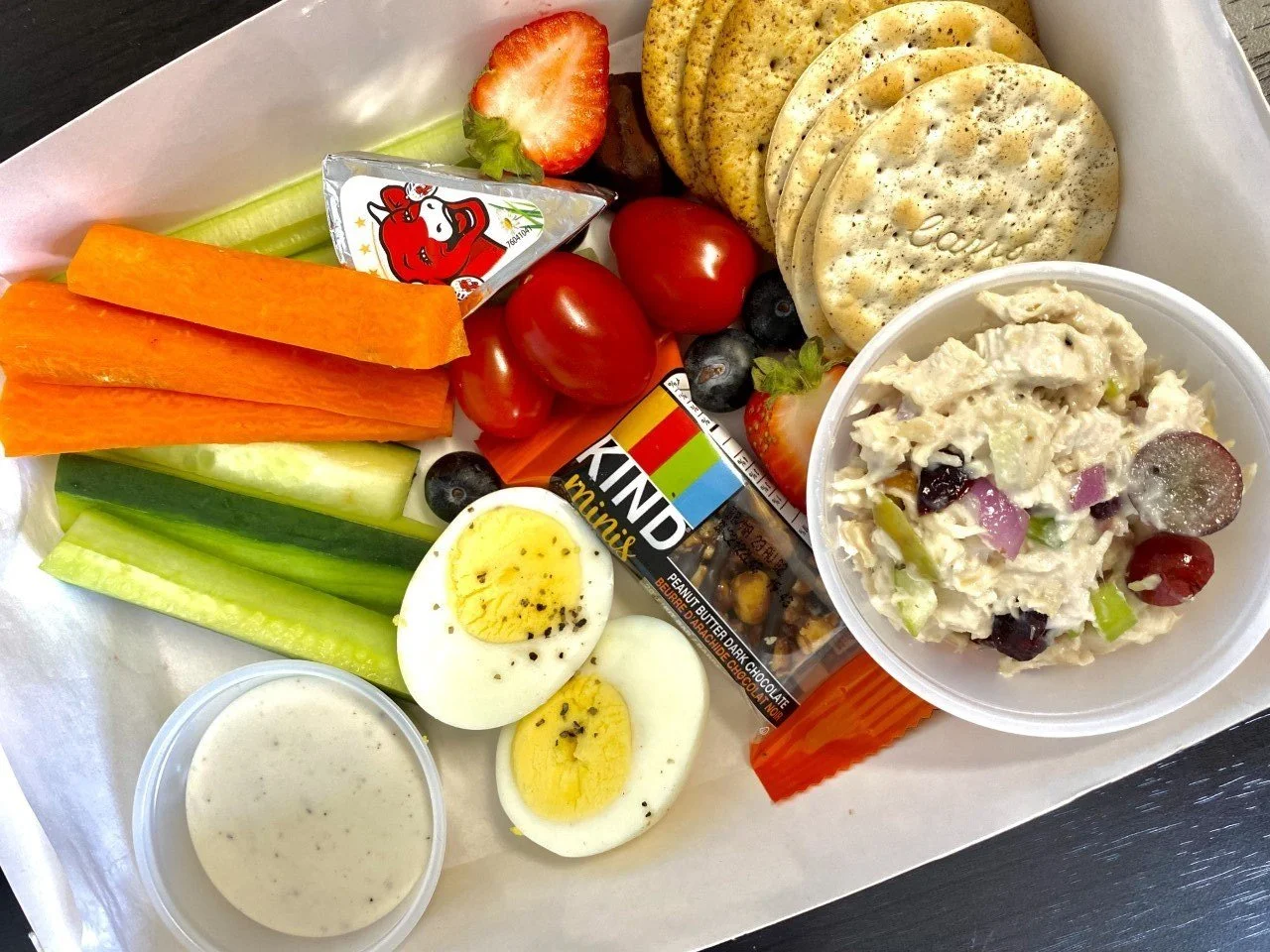 hardboiled egg, fresh veggies & dip, fruit, crackers, chicken salad, cheese and a granola bar