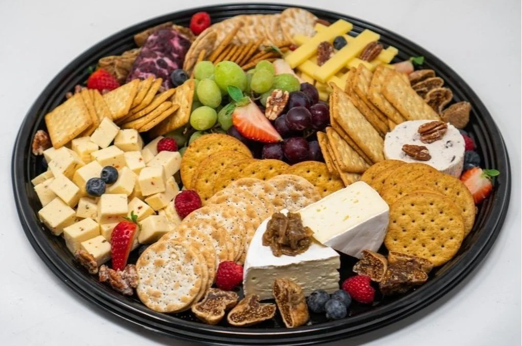 assortment of premium imported & domestic cheeses garnished with fresh strawberries, grapes, blueberries, dried fruit, nuts, & crackers