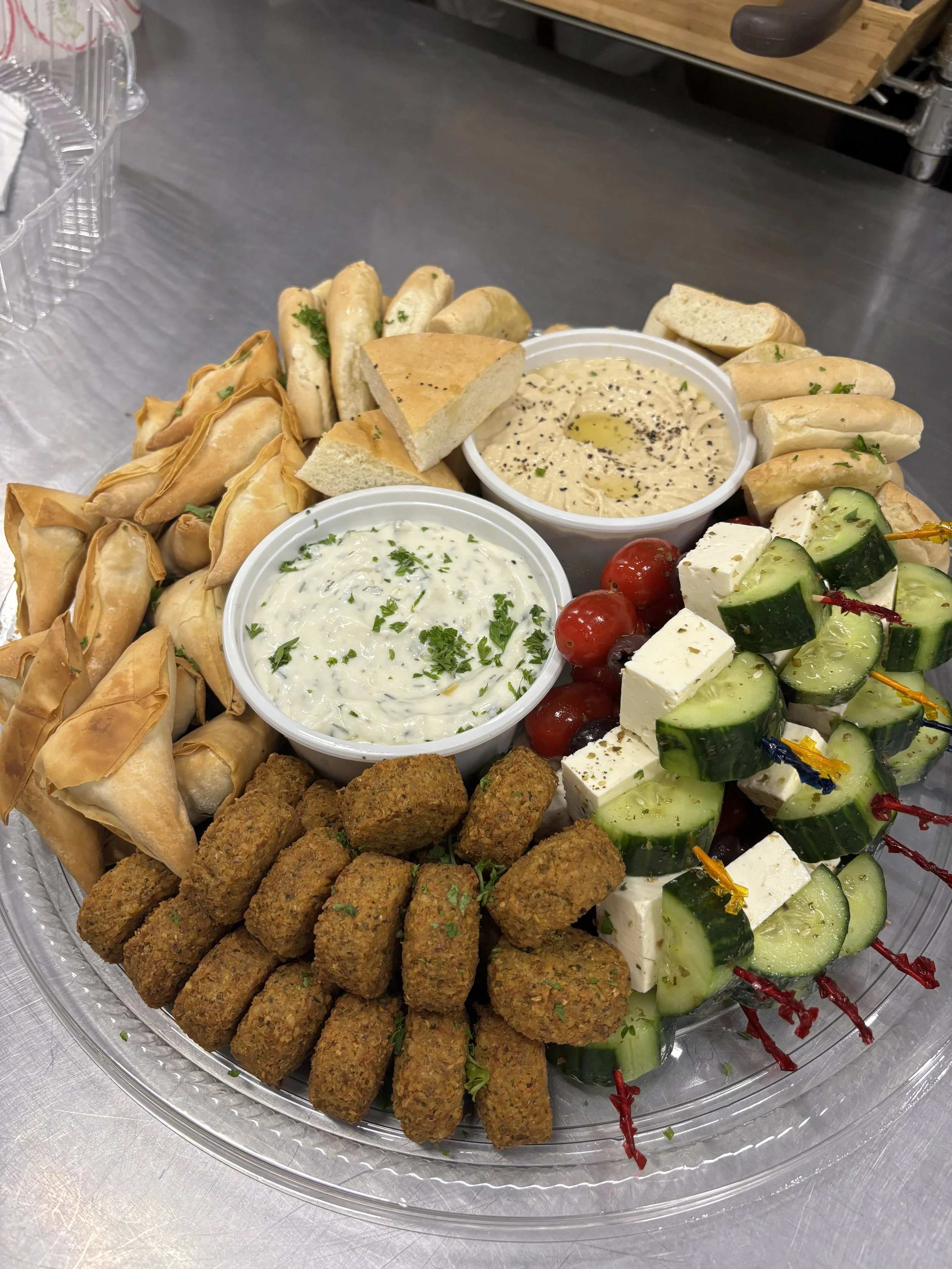 Hummus, tzatziki, mini spanakopita, falafel, & mini greek salad skewers, with pita bread